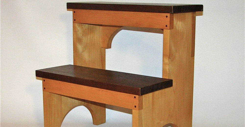 A shaker-style two-step stepstool, in contrasting hardwoods.
